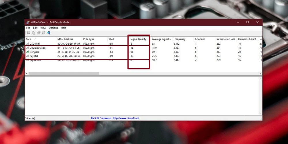 Ứng dụng cung cấp đầy đủ thông tin cần thiết về những mạng mạng WiFi xung quanh. Tuy nhiên, trong khuôn khổ bài viết này, chúng ta chỉ quan tâm đến cường độ tín hiệu nên chỉ cần để ý đến cột Signal Quality. Nếu con số này càng cao thì tín hiệu càng mạnh và ngược lại.