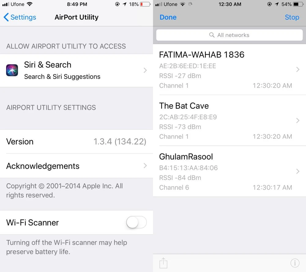 Khi hoàn tất, bạn hãy truy cập vào phần Settings (cài đặt) > AirPort Utility > Wi-Fi Scanner và đợi một lát để ứng dụng quét các mạng WiFi xung quanh. Mỗi mạng sẽ xuất hiện với một chỉ số dBm đi kèm (số âm), nếu giá trị càng lớn thì cường độ tín hiệu càng tốt và ngược lại.