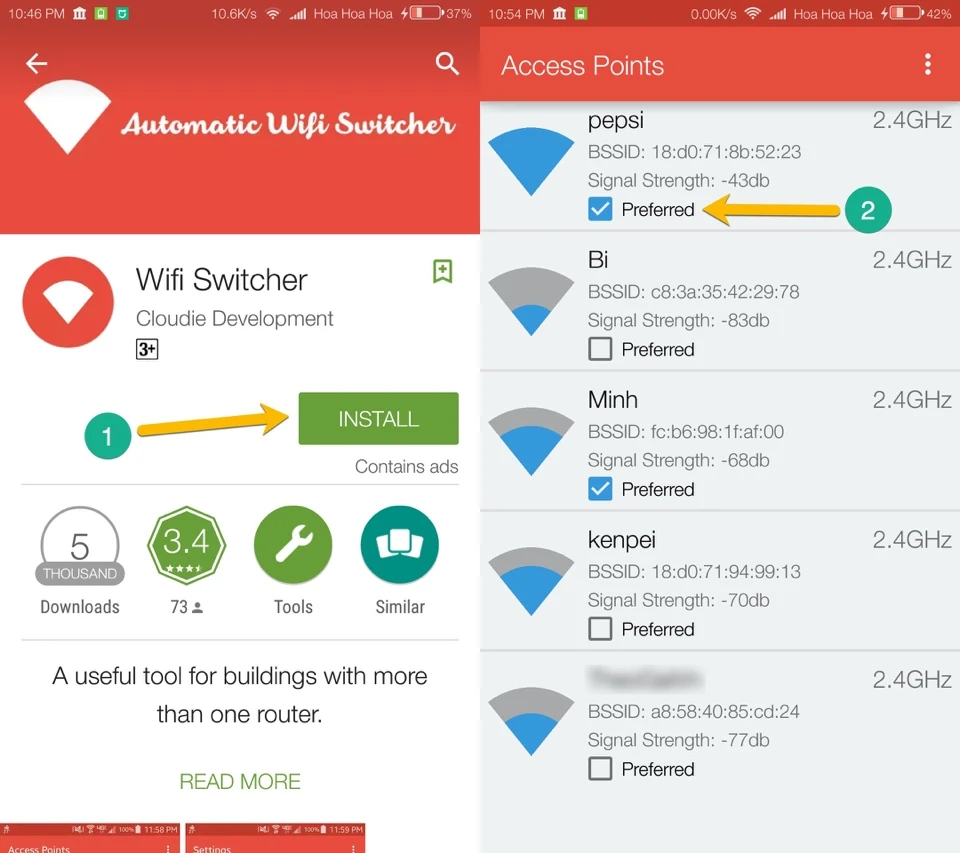 Nếu muốn smartphone tự động phân tích và luôn kết nối với WiFi mạnh nhất, bạn có thể cài đặt ứng dụng Wifi Switcher do Cloudie phát triển, được cung cấp miễn phí tại địa chỉ https://goo.gl/ovz2cL.