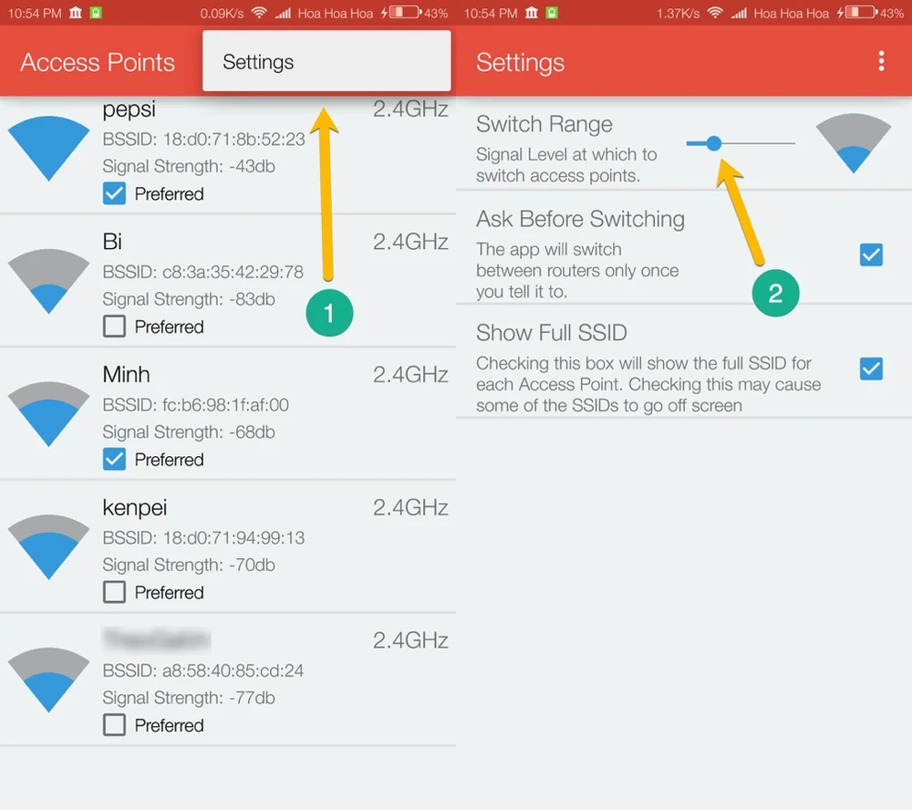 - Bước 3: Nếu muốn thay đổi một số thiết lập, bạn hãy chạm vào biểu tượng ba chấm ở góc trên bên phải và chọn Settings. Tại đây sẽ có ba lựa chọn gồm Switch Range (ngưỡng tín hiệu cần thiết để thiết bị tự động kết nối WiFi khác, ví dụ như khi tín hiệu mạng chỉ còn một vạch sóng), Ask Before Switching (hỏi trước khi chuyển mạng) và cuối cùng là Show Full SSID (hiển thị đầy đủ tên mạng).