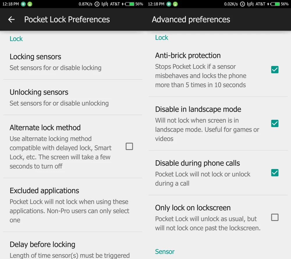 - Bước 3: Tại đây, người dùng có thể chọn loại cảm biến dùng để mở khóa gồm gia tốc và khoảng cách, hoặc sử dụng cả hai (Locking sensors). Thời gian chờ trước khi khóa máy (Deleay before locking), tắt Pocket Lock khi pin yếu (Stop when battery low)… và rất nhiều tùy chọn nâng cao khác trong phần Advanced preferences mà bạn có thể tự khám phá thêm trong quá trình sử dụng.