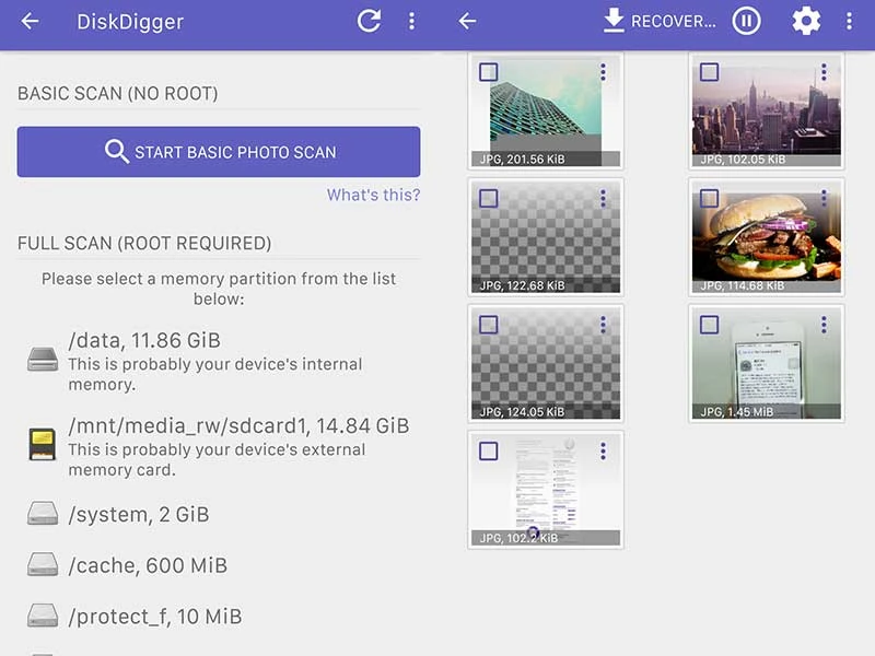 Phương pháp cuối cùng sẽ thực hiện việc khôi phục trực tiếp ngay trên smartphone, tuy nhiên yêu cầu thiết bị phải được root trước. Đầu tiên, bạn hãy cài đặt ứng dụng DiskDigger tại địa chỉ https://goo.gl/T0n3kh và cấp quyền cho ứng dụng khi được yêu cầu. Tiếp theo, bạn hãy lựa chọn phân vùng (bộ nhớ trong hoặc thẻ nhớ) và thiết lập các định dạng tập tin cần khôi phục gồm hình ảnh, âm nhạc, video…