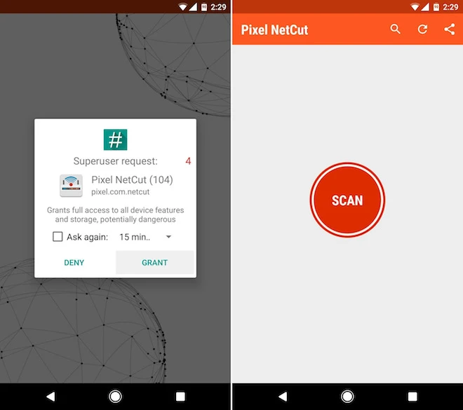 - Bước 2: Sau khi hoàn tất, bạn hãy mở ứng dụng và cấp quyền khi được yêu cầu. Để kiểm tra danh sách các thiết bị đang kết nối WiFi, bạn hãy nhấn vào nút Scan hoặc biểu tượng mũi tên xoay vòng ở góc trên bên phải.