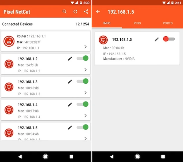 Ngoài ra, Pixel NetCut còn được tích hợp một số công cụ chẩn đoán mạng khá hữu dụng, đơn cử như khi chọn một thiết bị từ danh sách, bạn có thể thấy cổng (port) nào đang còn trống, cũng như thời gian ping và độ trễ.