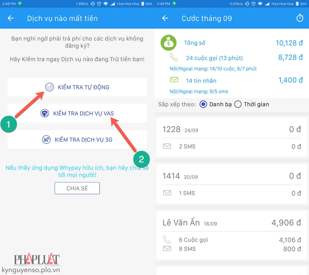 Bên cạnh đó, Whypay còn liệt kê chi tiết về tiền cước của từng cuộc điện thoại, tin nhắn theo ngày, tháng…