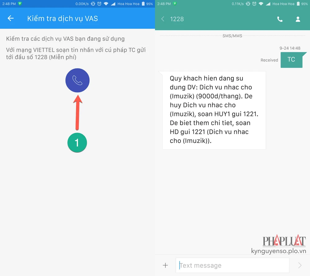 - Bước 3: Nếu muốn biết mình đang sử dụng dịch vụ gì, bạn hãy chọn Kiểm tra dịch vụ VAS, bấm vào nút gọi điện để gửi tin nhắn theo cú pháp được soạn sẵn. Kết quả trả về sẽ kèm theo cú pháp để bạn hủy những dịch vụ không bao giờ xài đến nhằm tránh bị mất tiền oan uổng.