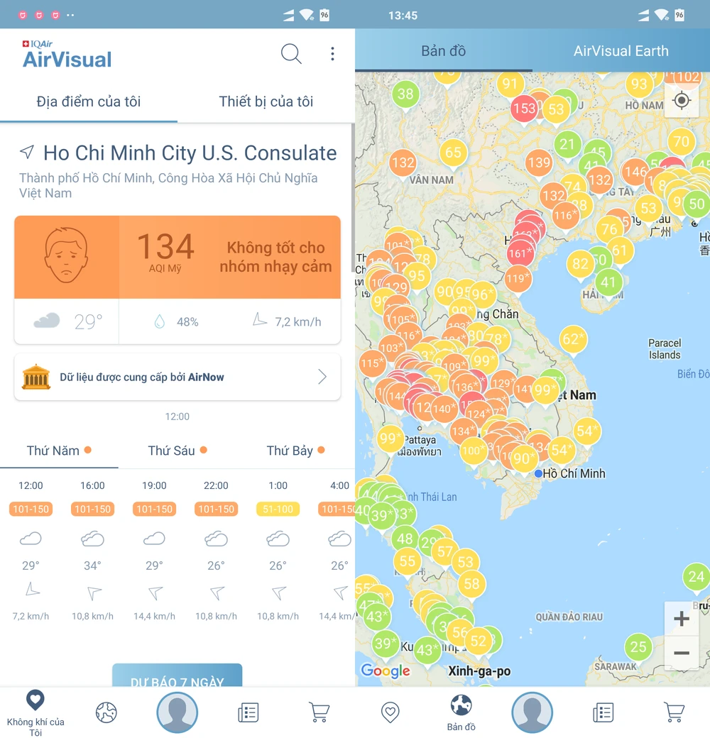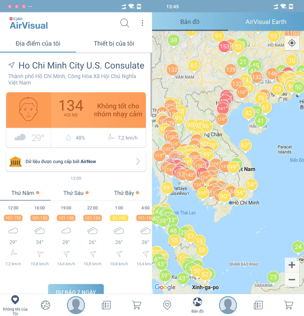Giao diện của chương trình khá đơn giản với các mục như Không khí của tôi, Bản đồ, Tin tức và Xếp hạng. Tại đây, người dùng có thể theo dõi AQI (chỉ số chất lượng không khí) theo từng mốc thời gian hoặc các ngày trong tuần. Thang đo chỉ số sẽ dao động từ 0-500, dưới mức 150 được coi là an toàn cho người bình thường, nếu hơn, người dùng cần phải trang bị khẩu trang chuyên dụng để lọc bụi mịn trước khi ra đường.
