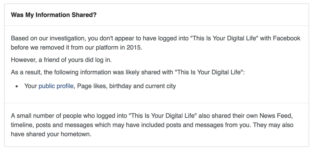 Ngược lại, nếu xuất hiện thông báo Based on our investigation, you don't appear to have logged into “This Is Your Digital Life” with Facebook before we removed it from our platform in 2015. However, a friend of yours did log in. (theo điều tra của chúng tôi, có vẻ bạn không đăng nhập vào “This Is Your Digital Life” bằng Facebook trước khi chúng tôi xóa ứng dụng này khỏi nền tảng của mình vào năm 2015. Tuy nhiên, một người bạn của bạn đã đăng nhập, do đó có khả năng các thông tin về Facebook cá nhân, lượt thích trang, sinh nhật, tỉnh/thành phố hiện tại của bạn đã bị chia sẻ).