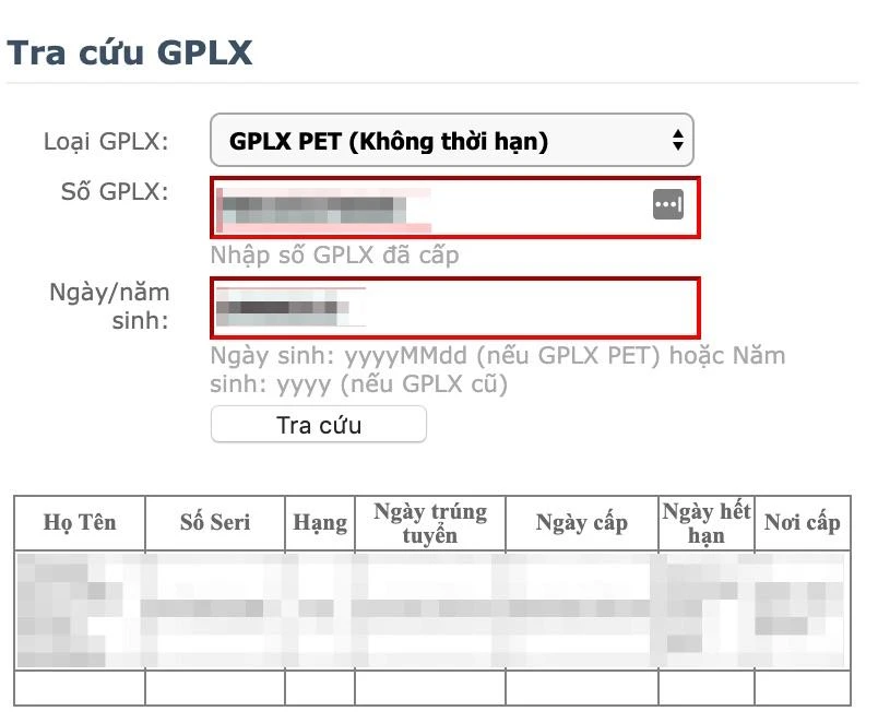 Tiếp theo, bạn cần lựa chọn loại GPLX đang sử dụng (loại làm bằng giấy bìa hoặc thẻ nhựa - PET), có thời hạn hoặc không thời hạn. Sau đó nhập số GPLX vào khung trống tương ứng, ngày tháng năm sinh viết theo dạng năm-tháng-ngày (nếu là GPLX PET) hoặc năm sinh đối với GPLX cũ rồi nhấn Tra cứu. Ví dụ, 19900101 (sinh năm 1990, tháng 01, ngày 01).