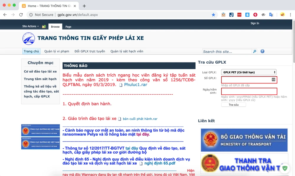 Đầu tiên, bạn hãy mở trình duyệt trên điện thoại hoặc máy tính và truy cập vào địa chỉ http://gplx.gov.vn/default.aspx và tìm đến phần tra cứu GPLX ở góc trên bên phải.