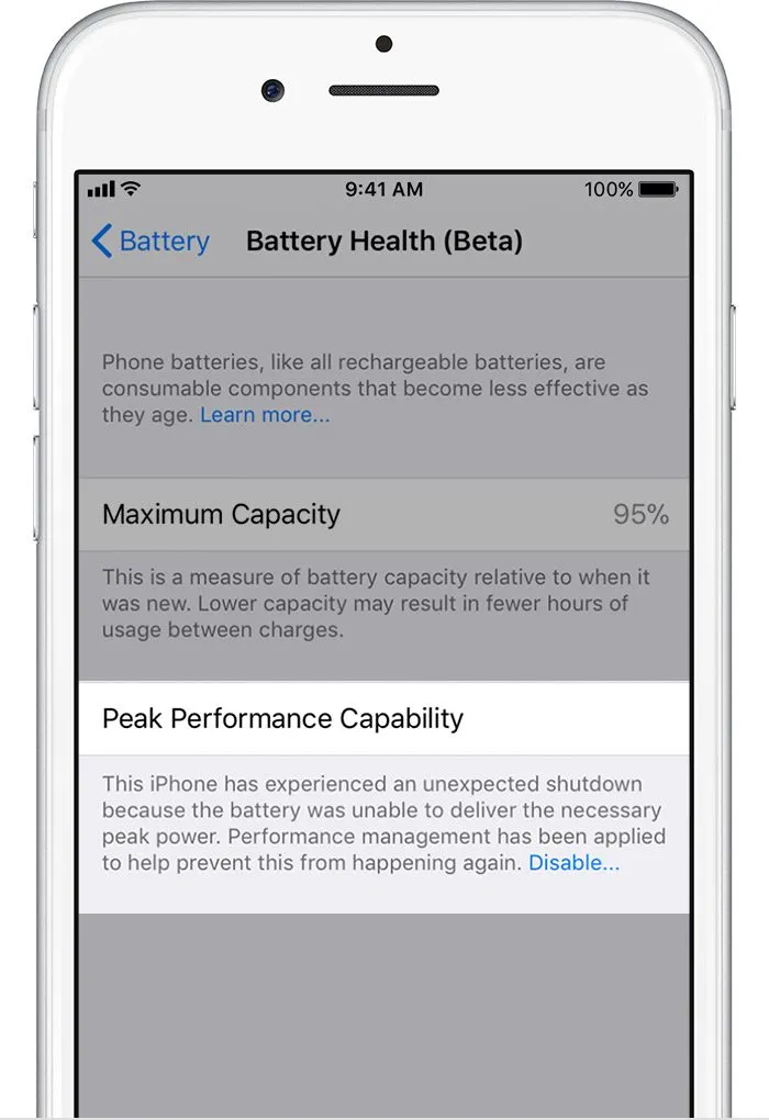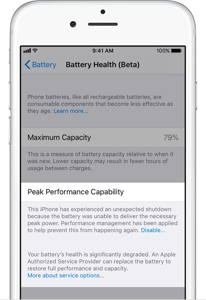 Nếu viên pin không còn đủ công suất, Apple khuyến cáo người dùng nên đi thay pin chính hãng càng sớm càng tốt. Trong trường hợp pin bị xuống cấp nghiêm trọng (công suất dưới mức 80%), Apple vẫn cho phép người dùng vô hiệu hóa tính năng làm chậm nhưng khả năng bị tắt máy đột ngột sẽ dễ xảy ra.