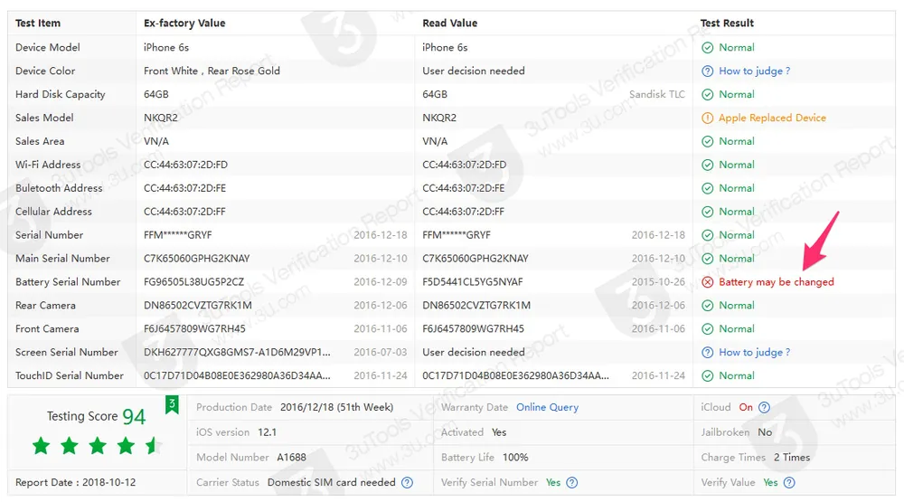 Giao diện chính của phần mềm sẽ hiển thị một vài thông tin cơ bản như phiên bản iOS đang sử dụng, IMEI, Serial, số lần sạc pin, độ chai pin… Tuy nhiên, trong khuôn khổ bài viết này, chúng ta chỉ quan tâm đến mục View Verification Report. Những mục nào có chữ Normal nghĩa là bình thường, ngược lại những mục đã bị thay thế sẽ được ghi chú bằng chữ đỏ. Ví dụ như hình bên dưới, iPhone đã được thay pin nên 3uTools sẽ hiển thị thông tin cảnh báo.