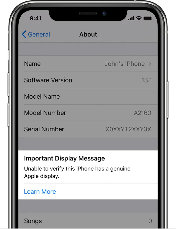 Bắt đầu với bản cập nhật iOS 13.1, người dùng iPhone 11 sẽ thấy xuất hiện cảnh báo nếu họ đang sử dụng thiết bị có màn hình không chính hãng. Để chủ động kiểm tra, bạn có thể vào Settings (cài đặt) > General (cài đặt chung) > About (giới thiệu).