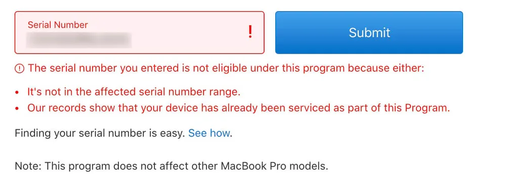 Nếu xuất hiện thông báo màu đỏ It's not in the affected serial number range nghĩa là MacBook của bạn không nằm trong danh sách bị ảnh hưởng và ngược lại.