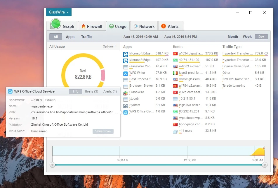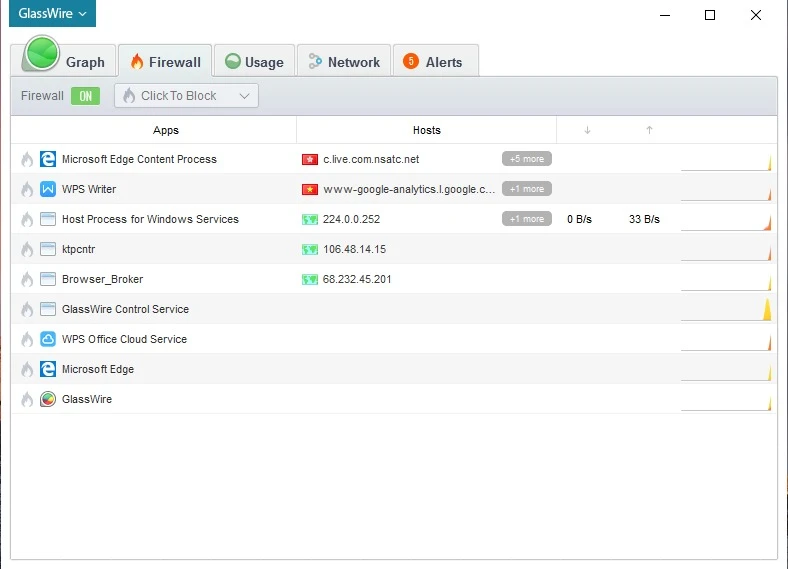GlassWire có giao diện khá trực quan, hiển thị toàn bộ thông tin về các ứng dụng và những tiến trình đang chạy ngầm trên hệ thống. Ngoài ra, phần mềm này còn tích hợp sẵn tính năng tường lửa và an ninh hệ thống, đi kèm theo đó là các số liệu lưu lượng download/upload của từng ứng dụng.
