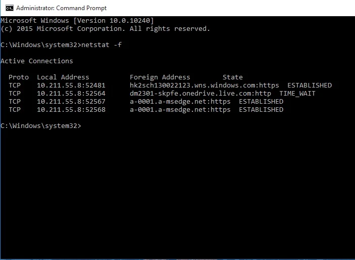 Tiếp theo, bạn hãy gõ dòng lệnh netstat abf để xem toàn bộ các cú pháp liên quan. Theo đó, tùy chọn -a sẽ liệt kê tất cả thông tin về cổng kết nối, tùy chọn -f sẽ hiển thị tên miền đầy đủ mà các ứng dụng đang kết nối đến… Để sử dụng, bạn chỉ cần thay thế từ abf thành các tùy chọn tương ứng, ví dụ netstat -f rồi nhấn Enter.