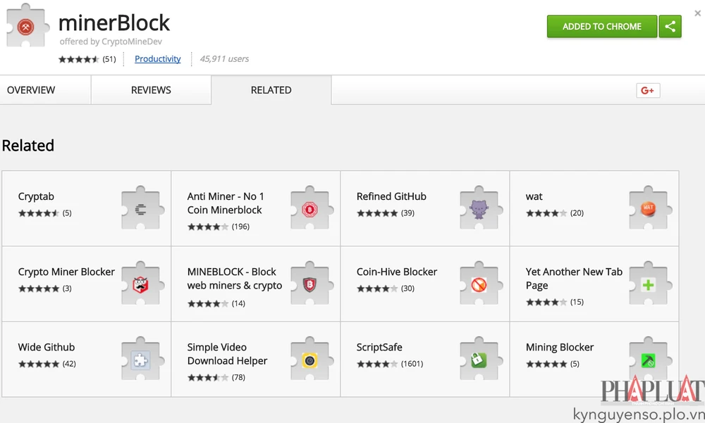 Đầu tiên, bạn hãy cài đặt tiện ích mở rộng minerBlock tại địa chỉ https://goo.gl/w4q8uU, nhấn Add to Chrome (thêm vào Chrome) > Add extension (thêm tiện ích). minerBlock tương thích với Google Chrome, Cốc Cốc, Yandex và các trình duyệt sử dụng mã nguồn mở Chromium.