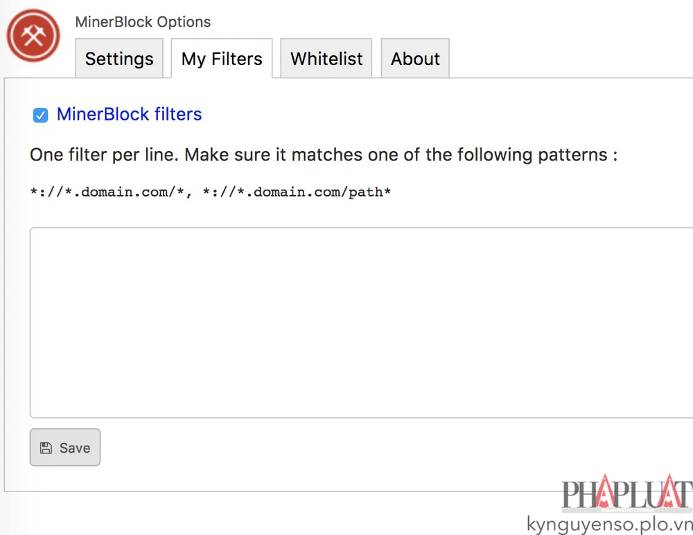 Trong phần Settings (cài đặt), người dùng có thể tự thêm vào các trang web sử dụng script để đào Bitcoin mà minerBlock chưa cập nhật theo đúng cú pháp hướng dẫn, sau đó nhấn Save để lưu lại.