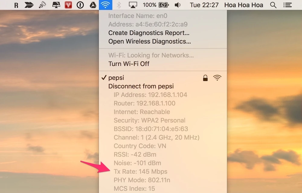 - Bước 1: Thao tác kiểm tra trên macOS tương đối đơn giản, việc bạn cần làm là giữ im phím option/alt, sau đó nhấn vào biểu tượng Wi-Fi ở góc trên bên phải. Lúc này, hệ thống sẽ hiển thị khá nhiều thông tin bao gồm địa chỉ IP, địa chỉ MAC, chuẩn Wi-Fi và tốc độ kết nối Wi-Fi (được ký hiệu là Tx Rate).