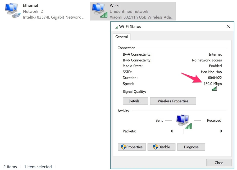 - Bước 2: Tiếp theo, bạn nhấp đôi vào kết nối mạng đang sử dụng. Mục Speed chính là nơi hiển thị tốc độ kết nối Wi-Fi hiện tại, đi kèm theo đó là một số thông tin cơ bản gồm tên mạng, thời gian kết nối và chất lượng tín hiệu. Nếu muốn biết nhiều hơn, người dùng có thể nhấp vào nút Details ở ngay bên dưới.