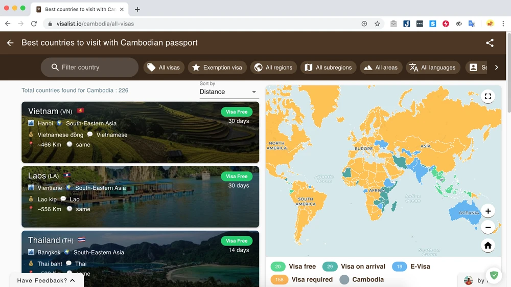 Trong trang mới hiện ra, Visalist sẽ gợi ý một số quốc gia mà bạn có thể du lịch theo Distance (khoảng cách), tất nhiên người dùng có thể lọc lại danh sách theo Visa type (loại thị thực) hoặc Aphabet (bảng chữ cái). Những quốc gia nào được gắn thẻ Visa Free đồng nghĩa với việc bạn có thể du lịch đến đây mà không cần visa.