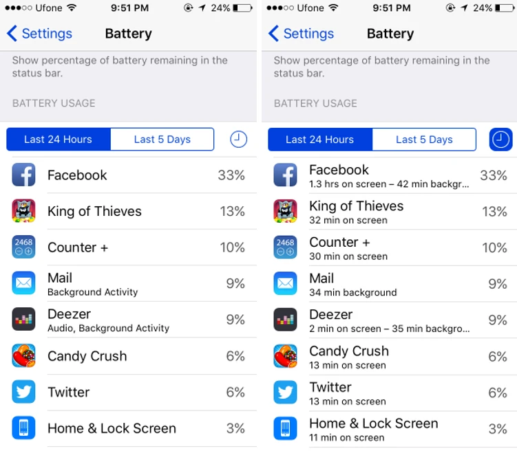 Tại thẻ Last 24 Hours, bạn có thể biết được lượng pin mà một chương trình đã sử dụng trong suốt 24 tiếng. Nếu muốn hiển thị nhiều thông tin hơn, người dùng chỉ cần kích vào biểu tượng đồng hồ ở cạnh phải để xem thời gian on screen cũng như thời gian chạy nền.