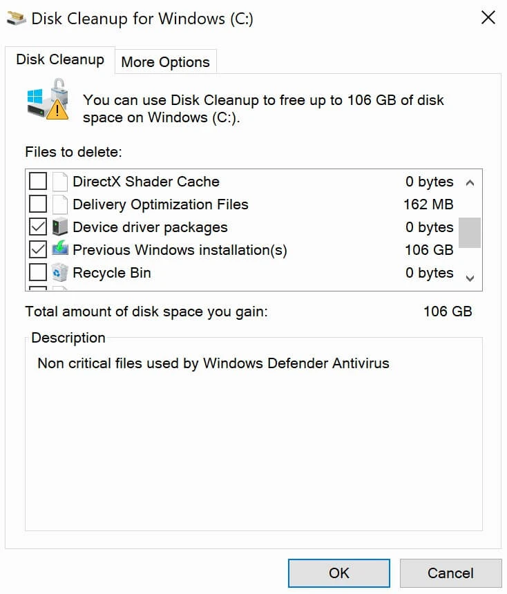 - Bước 2: Hệ thống sẽ tự động tính toán và liệt kê các tập tin mà người dùng có thể xóa, đơn cử như các tập tin tạm, các bản ghi... Lúc này, bạn hãy đánh dấu vào các mục cần xóa như Windows.old (hoặc Previous Windows Installation(s)) rồi nhấn OK và chờ một lát cho đến khi quá trình này hoàn tất.
