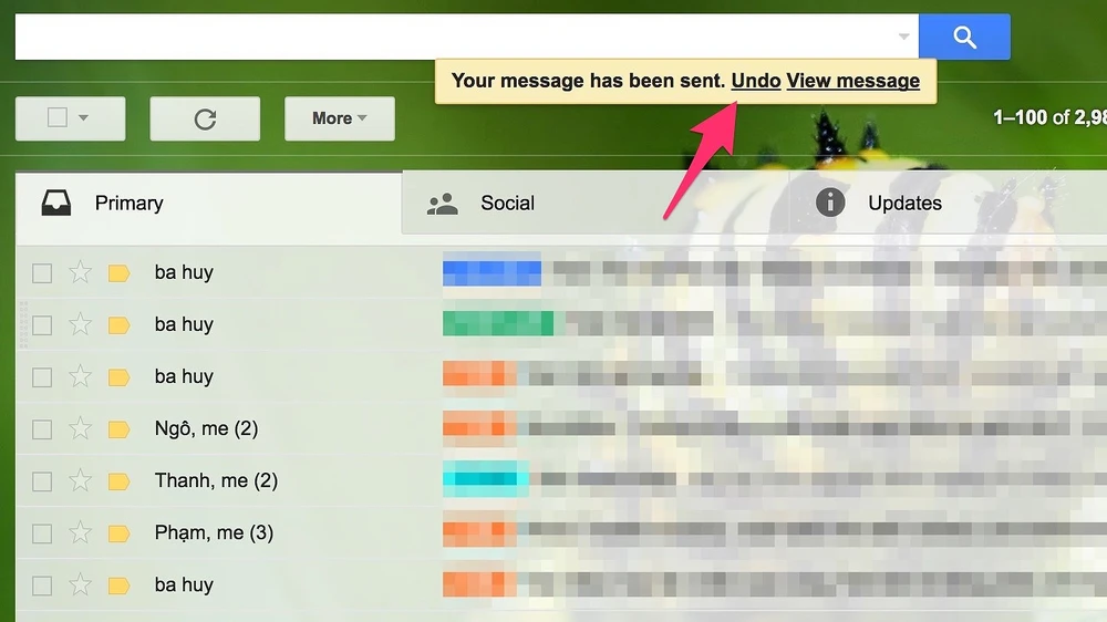 Kể từ lúc này, mỗi khi gửi email hoàn tất bạn sẽ thấy xuất hiện dòng thông báo Your message has been sent. Undo - View vessage, cho phép người dùng lấy lại email thông qua tùy chọn Undo.