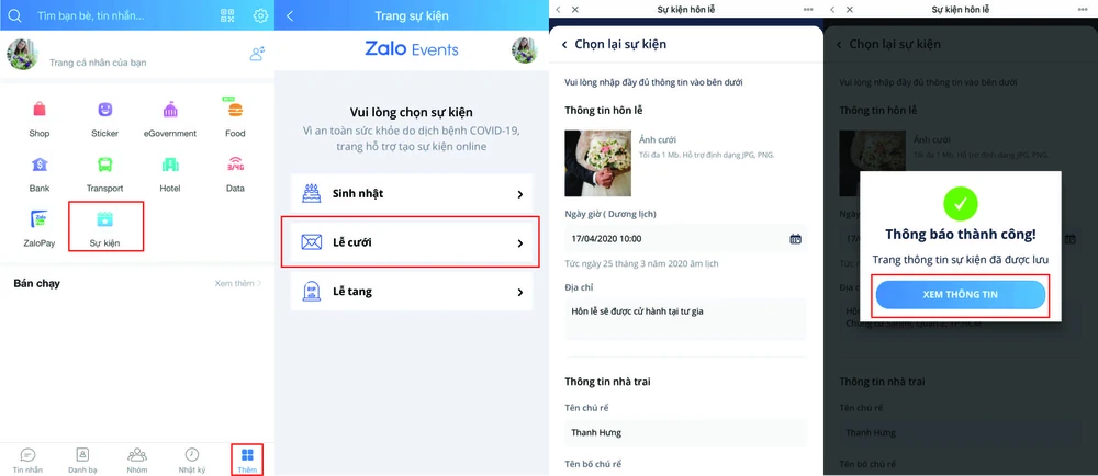 Để tạo sự kiện, bạn có thể truy cập vào địa chỉ https://sukien.net.vn/. Trong trường hợp sử dụng Zalo, người dùng chỉ cần bấm vào mục Thêm - Sự kiện (lễ cưới, sinh nhật, lễ tang).