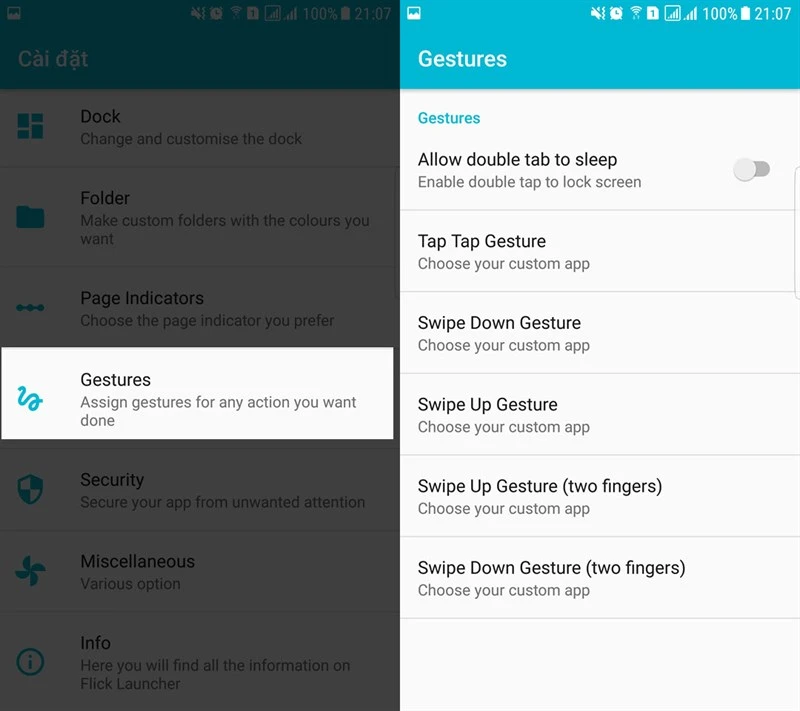 Nếu dế yêu được trang bị cảm biến vân tay, Flick Launcher cho phép bạn mở khóa chỉ với một cú chạm mà không cần bấm vào phím nguồn. Ngoài ra, người dùng còn có thể nhấp đôi để tắt màn hình, vuốt lên, xuống để mở app...
