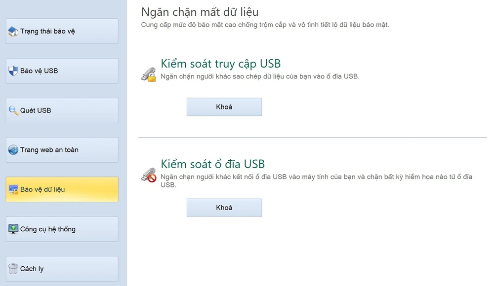 Khi cắm USB vào máy tính, phần mềm sẽ tự động quét toàn bộ dữ liệu, xóa các tập tin độc hại hoặc chuyển sang mục Cách ly. Ngoài ra, người dùng cũng có thể chủ động thực hiện việc này thông qua mục Quét USB.