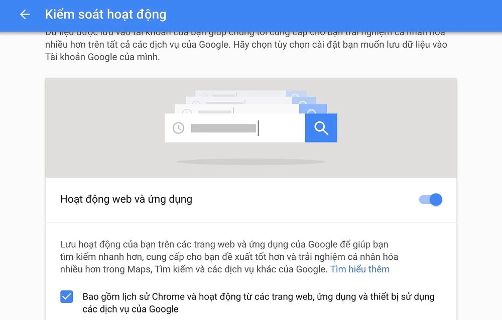 Tại đây gồm có các tùy chọn Hoạt động web và ứng dụng, Lịch sử vị trí (chính là những địa điểm mà bạn đã đến), Thông tin thiết bị, Hoạt động bằng giọng nói và âm thanh, Lịch sử tìm kiếm và các video đã xem trên YouTube… Nếu muốn bảo mật thông tin cá nhân, bạn có thể tắt bớt các tùy chọn không cần thiết bằng cách kích vào nút gạt màu xanh ở ngay bên cạnh.