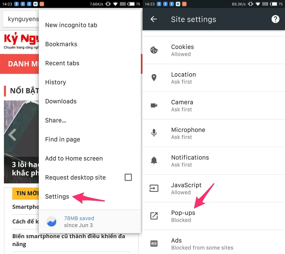 Để hạn chế tình trạng trên, bạn hãy vô hiệu hóa tính năng hiển thị pop-up trên trình duyệt Chrome bằng cách mở ứng dụng, bấm vào biểu tượng menu ở góc trên bên phải và chọn Settings (cài đặt) > Site settings (cài đặt trang web) > Pop-ups và vô hiệu hóa tùy chọn Pop-ups.