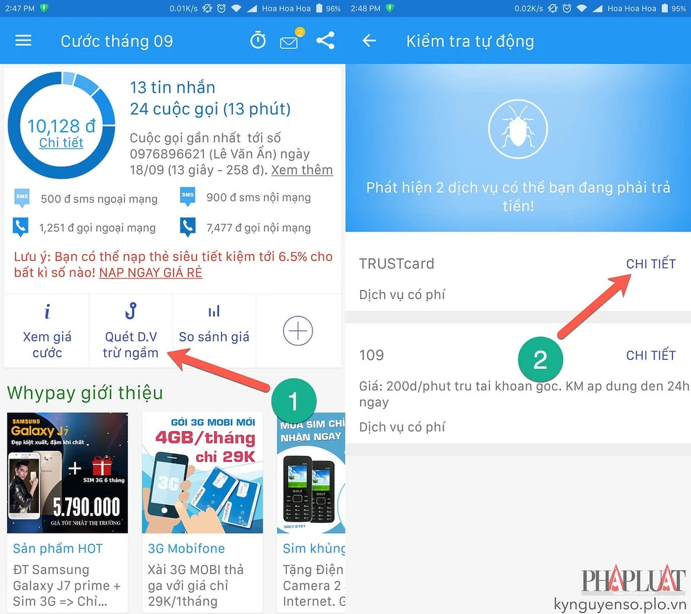 Để mọi thứ có thể khách quan và “minh bạch” hơn, bạn hãy cài đặt ứng dụng Whypay tại địa chỉ https://whypay.vn/ (tương thích các thiết bị Android và iOS). Khi hoàn tất, người dùng chỉ cần lựa chọn nhà mạng tương ứng và gói cước đang sử dụng. Tại giao diện chính, bạn hãy chạm vào mục Quét các D.V trừ ngầm > Kiểm tra dịch vụ VAS (giá trị gia tăng) và gửi tin nhắn theo cú pháp được soạn sẵn. Khi có kết quả, người dùng chỉ cần nhắn tin hủy bớt các dịch vụ không cần thiết để tránh bị mất tiền oan uổng.