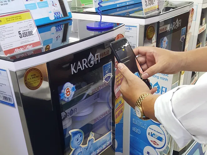 Khách hàng đang kiểm tra máy lọc nước chính hãng bằng ứng dụng quét mã.