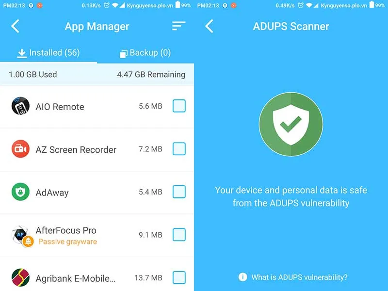 Nếu lo ngại thiết bị đang sử dụng bị theo dõi và ăn cắp dữ liệu, đầu tiên bạn hãy truy cập vào địa chỉ https://goo.gl/a81lZj và cài đặt ứng dụng Trustlook Antivirus & Mobile Security. Giao diện chính của phần mềm tương đối đơn giản với các nút chức năng chính gồm Scan (quét hệ thống), Boost (tăng tốc), App Manager (quản lý ứng dụng) và App Lock (khóa ứng dụng). Để phát hiện phần mềm AdUps, người dùng chỉ cần nhấp vào tùy chọn Check it now tại mục ADUPS Vulnerability.