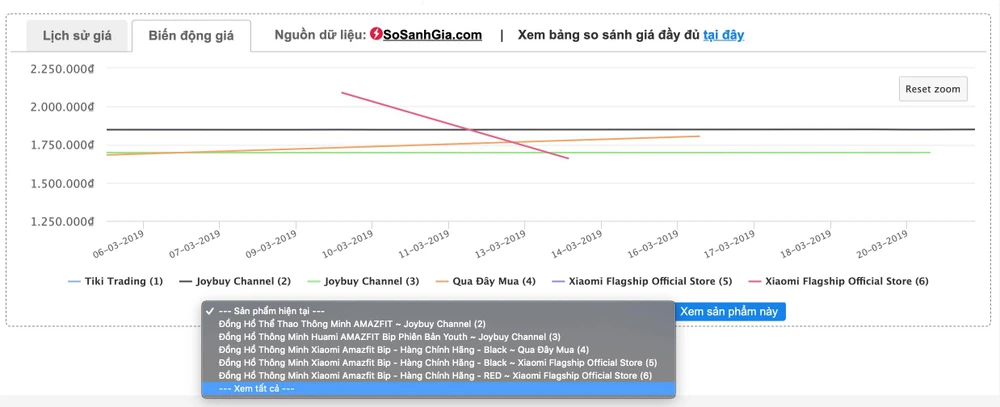 Để so sánh giá một món hàng giữa nhiều cửa hàng, bạn chỉ cần bấm vào menu nhỏ ở ngay bên dưới và chọn Xem tất cả, hoặc bấm vào tên cửa hàng ngay trên biểu đồ.