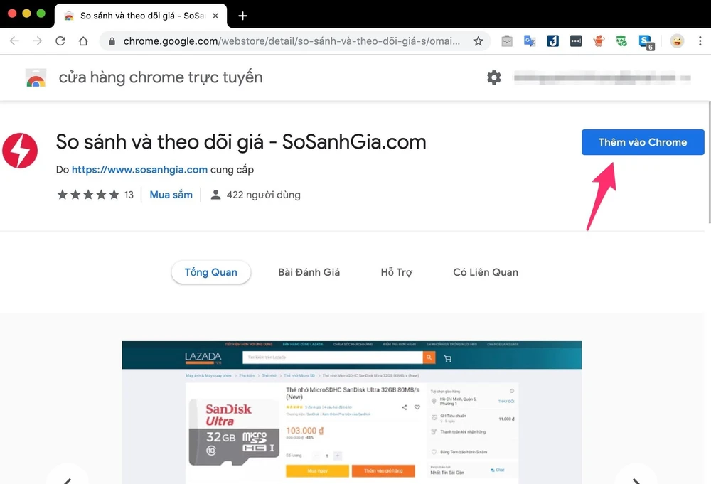 Đầu tiên, bạn hãy cài đặt tiện ích So sánh và theo dõi giá tại địa chỉ http://bit.ly/ssgia, tương thích với Google Chrome, Opera, Cốc Cốc, Yandex,… và các trình duyệt sử dụng mã nguồn mở Chromium. Khi hoàn tất, biểu tượng của tiện ích sẽ xuất hiện ở góc trên bên phải.