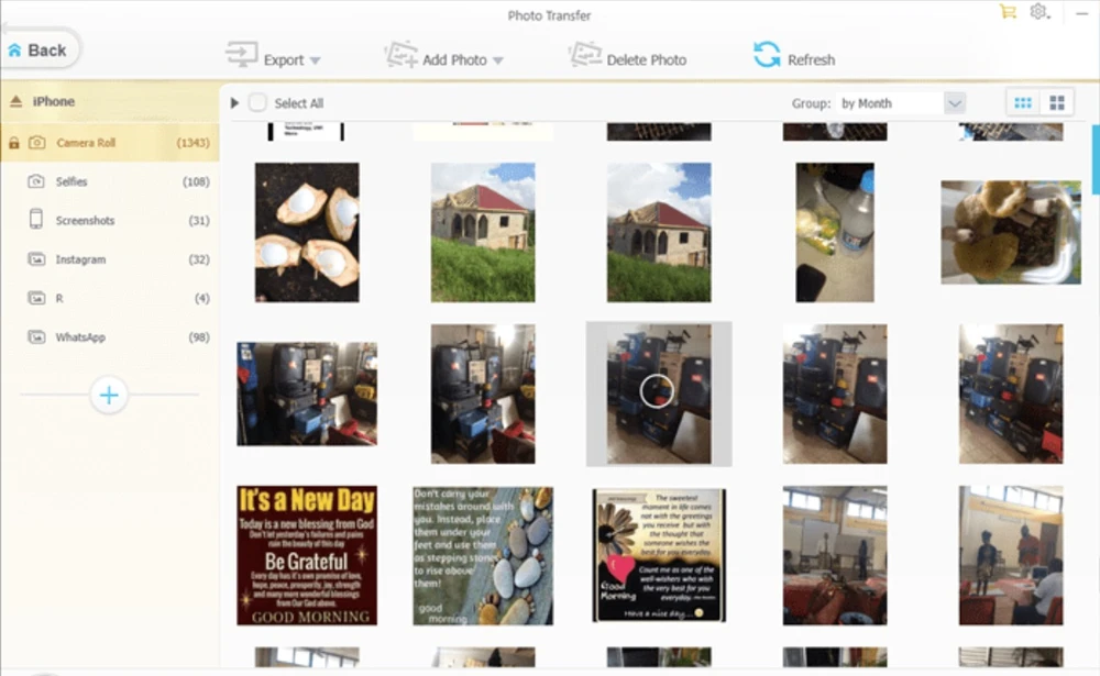 - Bước 3: Nếu muốn sao lưu hình ảnh, bạn chỉ cần bấm vào mục Photo Transfer. Trong cửa sổ mới hiện ra, người dùng có thể xem hoặc xóa hình ảnh trên iPhone thông qua máy tính hoặc thêm hình ảnh vào iPhone bằng cách kéo thả. Ngoài ra, WinX MediaTrans còn hỗ trợ chuyển định dạng ảnh HEIC của Apple sang định dạng JPEG thông qua tùy chọn Export HEIC to JPEG.