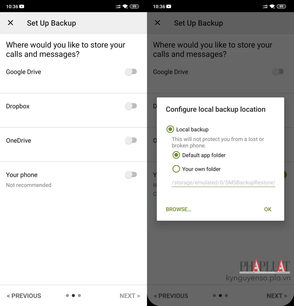 - Bước 3: Để lưu trữ các tập tin sao lưu trên điện thoại, bạn hãy chọn Your phone, đặt tên và lựa chọn nơi lưu trữ, tuy nhiên cách này không được khuyến khích. Thay vào đó, người dùng nên sao lưu dữ liệu lên các dịch vụ đám mây như Google Drive, Dropbox và OneDrive, sau đó đăng nhập bằng tài khoản tương ứng.