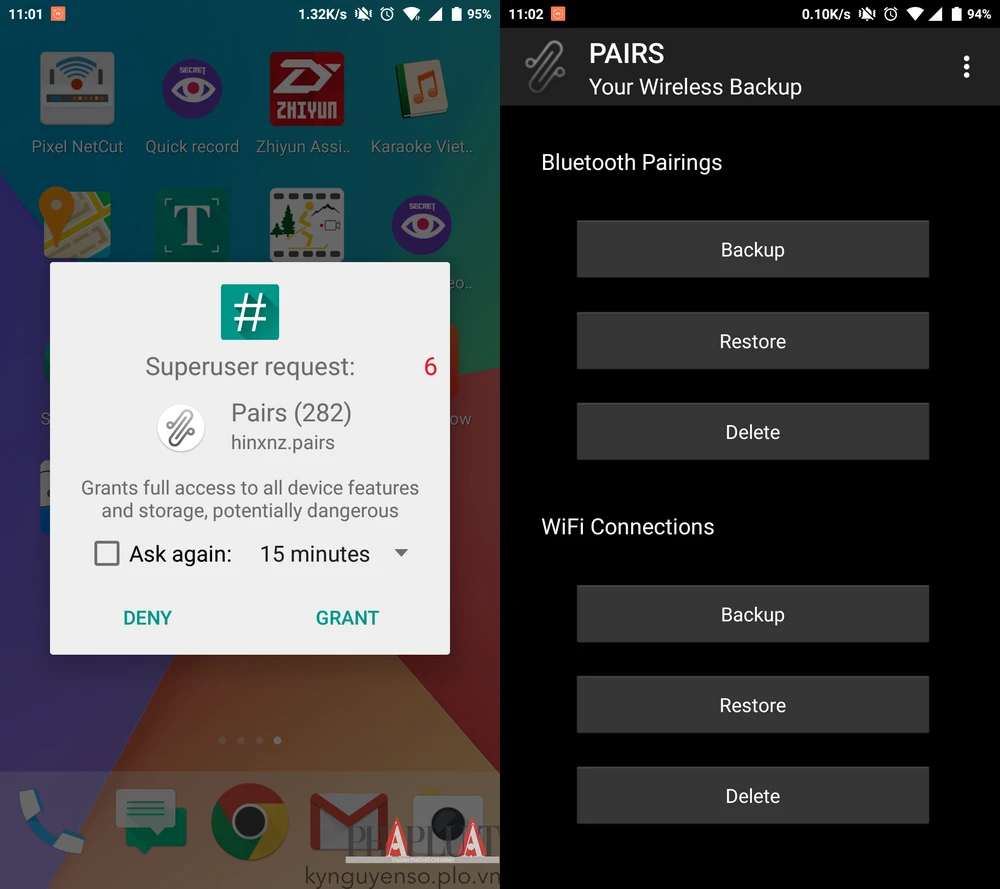 - Bước 1: Đầu tiên, bạn hãy tải và cài đặt ứng dụng PAIRS cho smartphone Android tại địa chỉ https://goo.gl/O3eSJ3, yêu cầu thiết bị đã được root trước đó. Nếu chưa, bạn chỉ cần root máy bằng các phần mềm chuyên dụng như KingRoot, One Click Root, CF Auto Root… Lưu ý, nếu đang sử dụng phiên bản PAIRS 1.0, người dùng cần phải gỡ bỏ trước khi cài đặt.