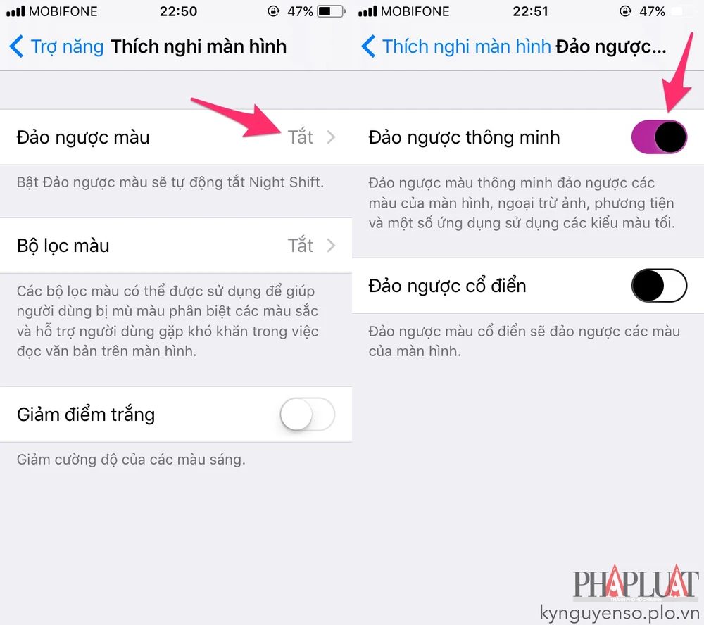 - Bước 2: Tại đây sẽ có hai tùy chọn gồm Smart Invert (đảo ngược thông minh) và Classic Invert (đảo ngược cổ điển). Theo đó, khi bạn kích hoạt chế độ Smart Invert, thiết bị sẽ đảo ngược màu của màn hình, ngoại trừ hình ảnh, các tập tin đa phương tiện và một số ứng dụng sử dụng kiểu màu tối. Ngược lại, chế độ Classic Invert sẽ chỉ đảo ngược màu màn hình.