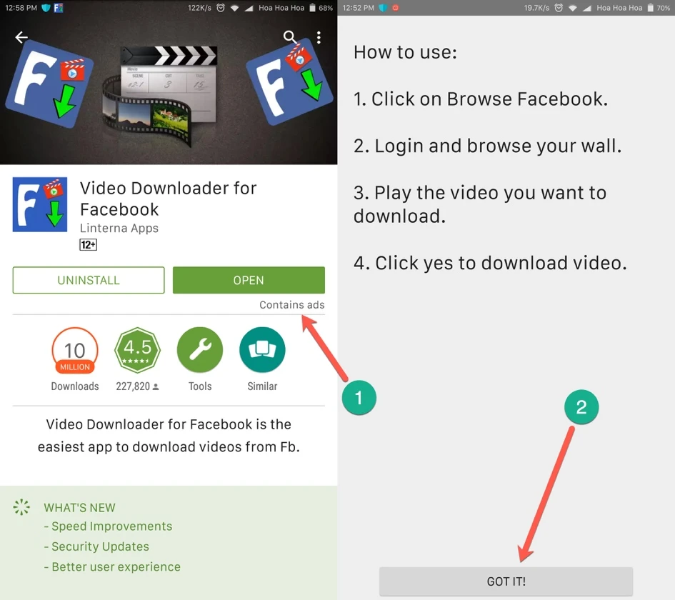 - Bước 1: Đầu tiên, bạn hãy tải và cài đặt ứng dụng Video Downloader for Facebook (VDF) do Linterna Apps phát triển tại https://goo.gl/WJBHGl, đọc kĩ hướng dẫn sử dụng và nhấn Got it khi đã hiểu.