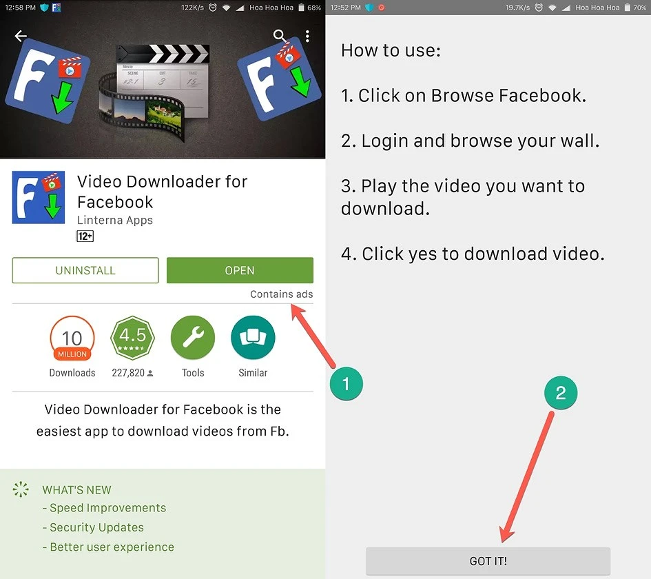 Ngoài ra, bạn cũng có thể cài đặt ứng dụng Video Downloader for Facebook (VDF) do Linterna Apps phát triển tại địa chỉ http://bit.ly/vd-fb, đọc kỹ hướng dẫn sử dụng và nhấn Got it khi đã hiểu. Tiếp theo, bạn mở ứng dụng VDF và nhấp vào tùy chọn Browse Facebook, đăng nhập Facebook bằng tài khoản tương ứng.