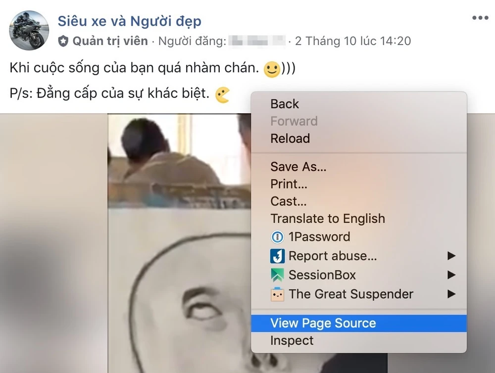 Trong trang mới hiện ra, bạn nhấn phải chuột lên vùng trống bất kỳ và chọn View Page Source (xem nguồn trang). Lưu ý, tùy chọn này chỉ xuất hiện trên trình duyệt Google Chrome, Firefox… (không bao gồm Safari).
