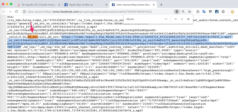 Tiếp theo, bạn nhấn Ctrl + F (Windows) hoặc command + F (macOS) để mở khung tìm kiếm trên trình duyệt, gõ từ khóa hd_src và nhấn Enter. Nếu phần hd_src hiển thị là null, người dùng chỉ cần gõ sd_src, sau đó sao chép lại toàn bộ liên kết nằm trong ngoặc kép như hình. Lưu ý, hd sẽ có chất lượng cao hơn sd.