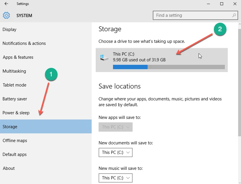 Để làm sạch ổ cứng, bạn hãy gõ từ khóa Settings vào khung tìm kiếm, truy cập vào mục System > Storage. Nhấp tiếp vào ổ hệ thống, kéo xuống bên dưới và tìm đến mục Temporary Files. Tại đây có một số mục mà bạn nên xóa như Temporaty Files (tập tin tạm), Empty recycle bin (làm trống thùng rác) và Previous version of Windows.
