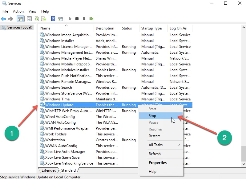 Đầu tiên, bạn cần phải tạm dừng dịch vụ Windows Update bằng cách gõ từ khóa Services vào khung tìm kiếm. Kích phải chuột vào kết quả và chọn Run as administrator. Tìm đến mục Windows Update, nhấp phải chuột vào đó và chọn Stop để dừng dịch vụ.
