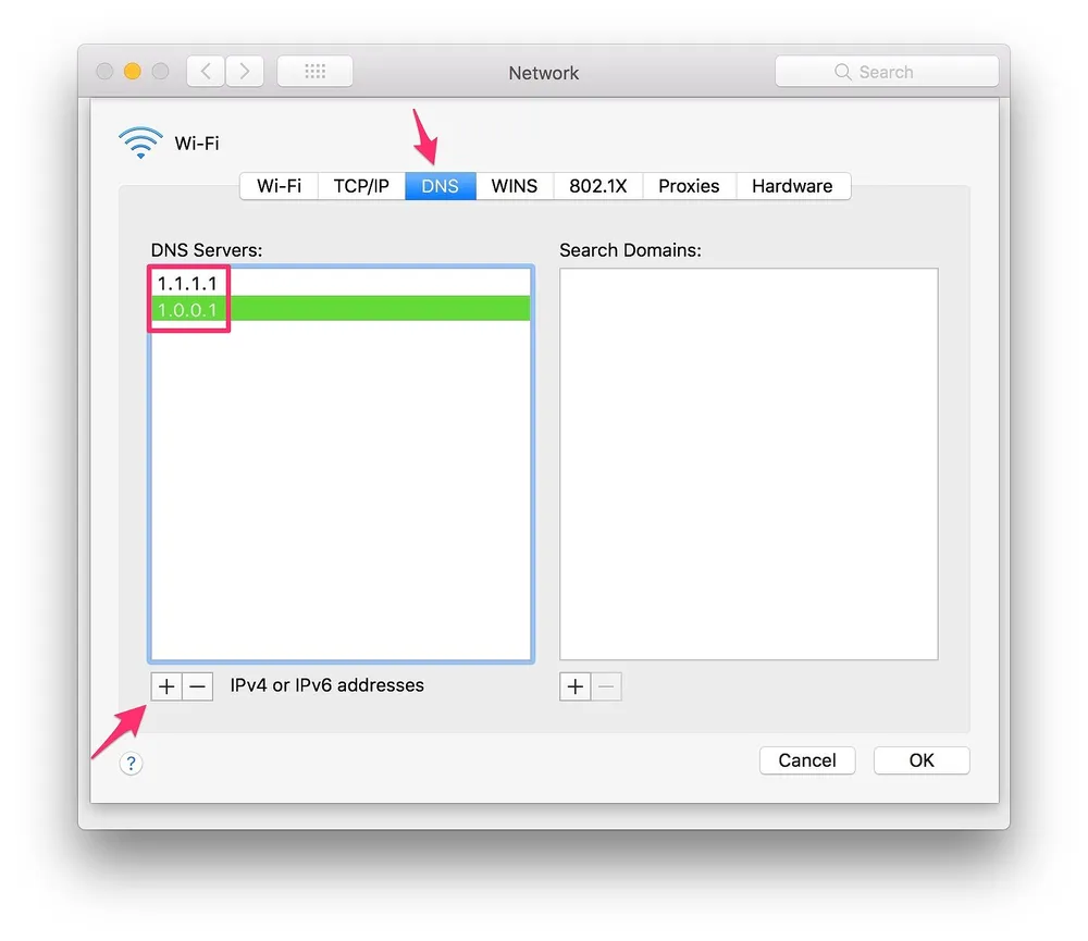 Tương tự, đối với các thiết bị macOS, bạn hãy nhấn vào biểu tượng WiFi ở góc phải màn hình Open Network Preferences. Trong cửa sổ mới hiện ra, bạn hãy chọn WiFi > Advanced > DNS, nhấn vào biểu tượng dấu cộng rồi nhập 1.1.1.1 và 1.0.0.1 rồi nhấn OK > Apply để lưu lại. Lưu ý, nếu đã thêm DNS trước đó, người dùng cần phải bấm chọn rồi nhấn vào biểu tượng dấu trừ để xóa bỏ.