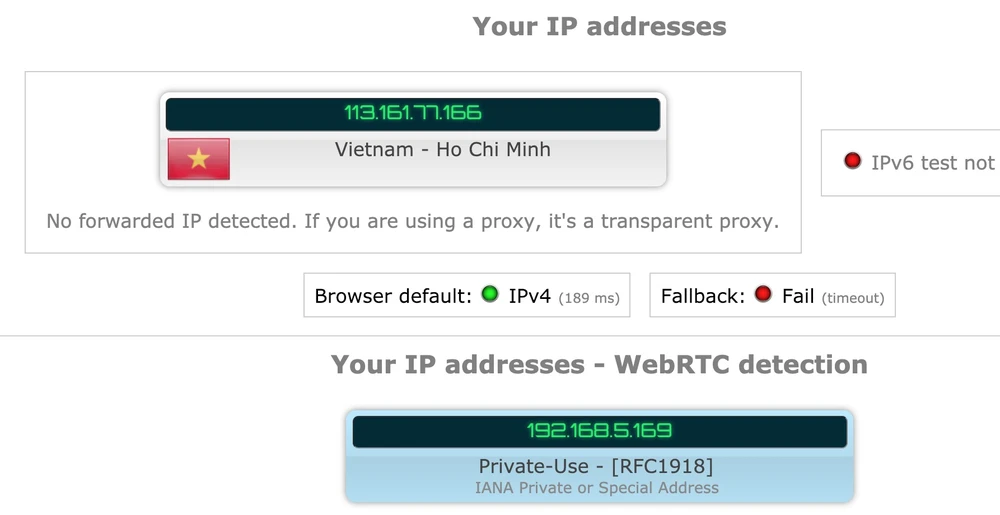 Để đảm bảo mọi thứ hoạt động chính xác, bạn nên kiểm tra địa chỉ IP và vị trí hiện tại bằng cách mở trình duyệt và truy cập vào trang https://ipleak.net/. Khi hoàn tất, bạn hãy nhìn vào ô bên dưới nơi ghi địa chỉ IP, nếu nó hiển thị một quốc gia khác, nghĩa là kết nối VPN đang hoạt động. Nếu tốc độ vẫn không cải thiện, bạn hãy thử đổi sang một máy chủ VPN khác như Canada, Mỹ, Thụy Sĩ, Đức hoặc Hungary.